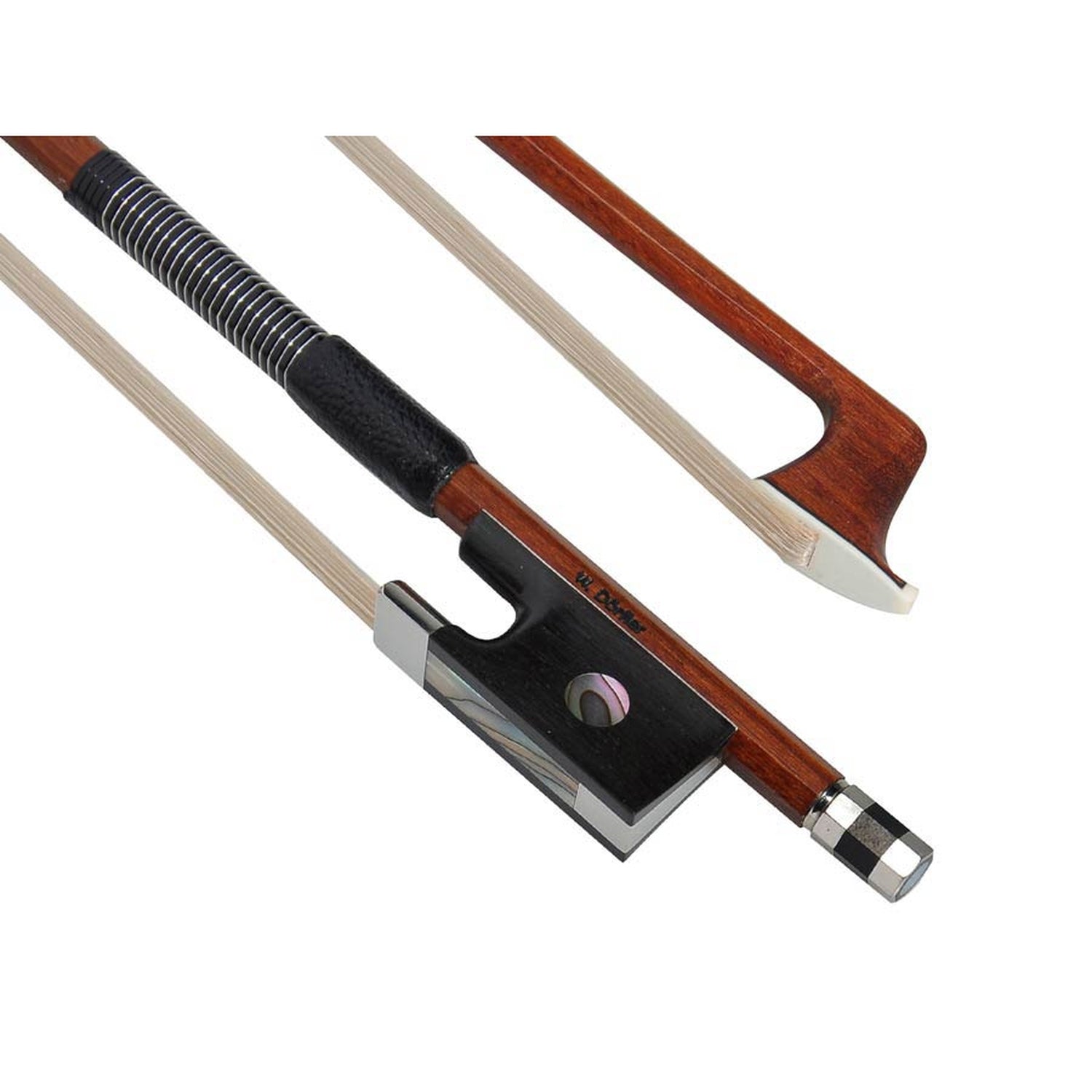 Uniek aan dit model is de elegante Engelse visbeenwikkeling, gecombineerd met metalen blanc draad. Deze afwerking zorgt niet alleen voor een opvallend visueel detail, maar draagt ook bij aan een uitgebalanceerde gewichtsverdeling. De strijkstok is voorzien van een ebbenhouten slof met hielplaat en een groot enkelvoudig oog, en afgewerkt met een klassieke drieledige eindknop met parelmoer inleg. De DV17-FS is de ideale keuze voor violisten die een onderscheidende, krachtige en elegante strijkstok zoeken binnen het gevorderde segment.